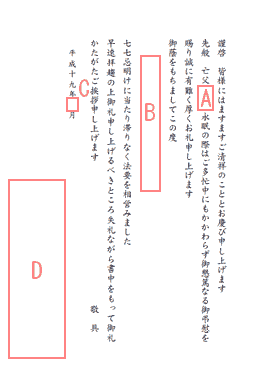 (1)封筒表面:御挨拶の印刷 …香典返しと同封する場合・郵便枠なし